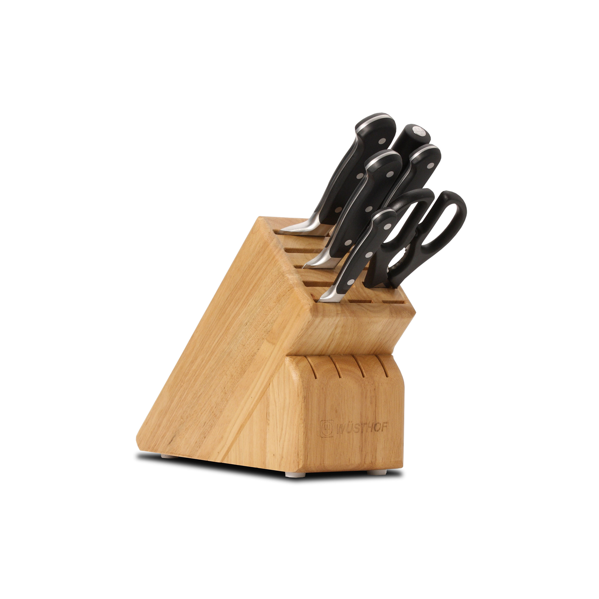 L'ensemble de 7 morceaux de Wüsthof appartenant à la série Classic. Cet ensemble contient 1 couteau d'office de 8 cm, 1 couteau d'office de 15 cm, 1 couteau à pain de 22 cm, 1 couteau de chef de 20 cm, 1 fusil à affûter de 22 cm, 1 paire de ciseaux de cuisine démontable et 1 bloc à couteaux en bois d'hêtre.