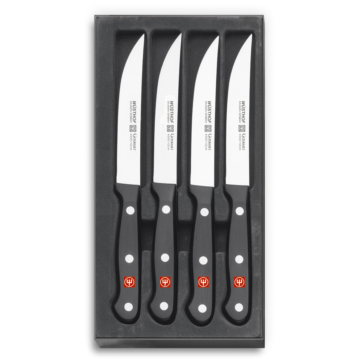 L'ensemble de couteaux à steak à 4 morceaux de Wüsthof appartenant à la série Gourmet. Cet ensemble contient 4 couteaux à steak de 12 cm.